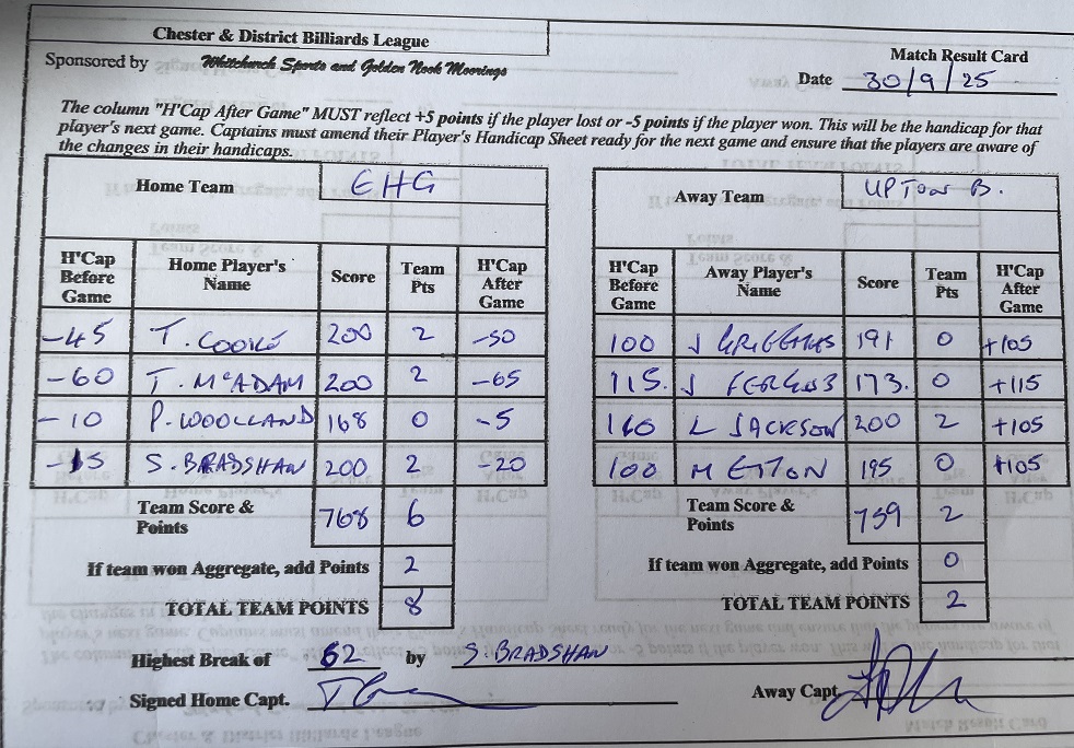 | UPTON B | 8 | v | 2 | EWLOE B | Week2 : 23rd September 2025 |